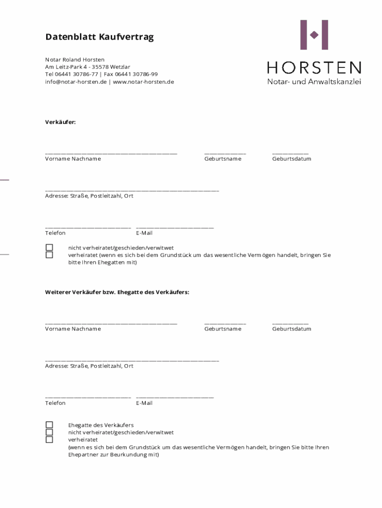 Barenblatt Kaufvertrag NOTAR Roland Thorsten Am Landmark 4 35578 Regular Tel 06441 3078677 | Fax 06441 3078699 info×notarhorsten.DE | www.notarhorsten.deVerkufer:___ Surname Nickname___ Geburtsname___