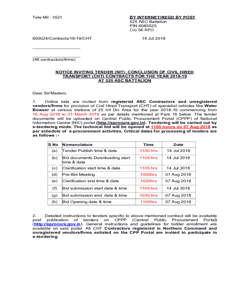 Tell Mil : 3521BY INTERNET×RED BY POST 525 ASC Battalion PIN9085525 C×o 56 APO600024×Contracts×1819/CHT14 Jul 2018___ ___ (All contractors×firms×NOTICE INVITING TENDER (NIT): CONCLUSION OF CIVIL