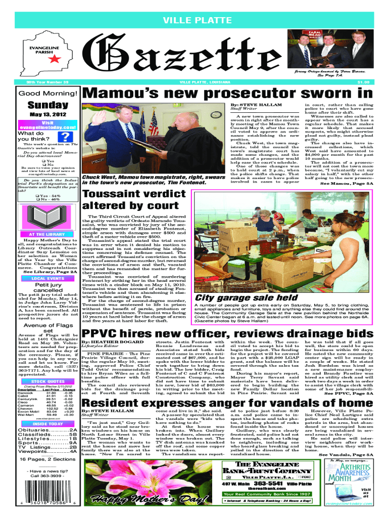 VILLA PLATTE98th Year Number 39Good Morning! SundayGazette VILLA PLATTE, Louisiana: STEVE HALL AM Staff WriterVisit evangelinetoday.com! What do you think? This week's question on The Gazettes' website