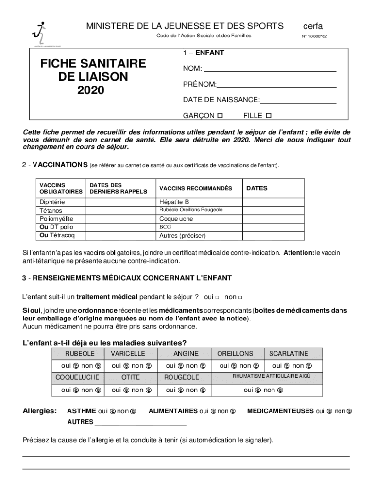 MINISTER DE LA TENNESSEE ET DES SPORTS Code de l\'Action Social et DES Famillescerfa N 10008×021 ENFANTFICHE SANITARY DE LIAISON 2020NOM: PROM: DATE DE RENAISSANCE: GARONFILLECette fiche permit DE