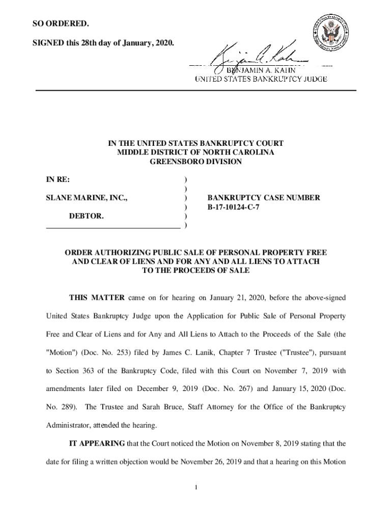 SO ORDERED. SIGNED this 28th day of January 2020.IN THE UNITED STATES BANKRUPTCY COURT MIDDLE DISTRICT OF NORTH CAROLINA GREENSBORO DIVISION IN RE:)) PLANE MARINE, INC., ) ) DEBTOR. ) ___)BANKRUPTCY