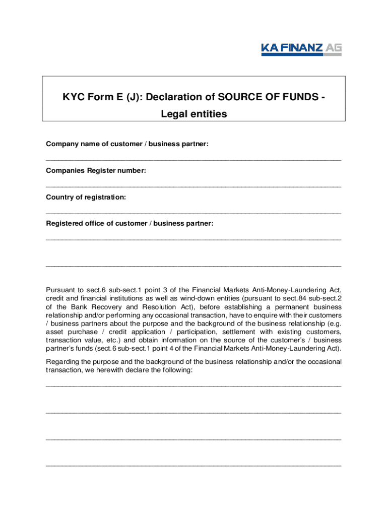 KYC Form E ×J): Declaration of SOURCE OF FUNDS Legal entities Company name of customer / business partner: ___ Companies Register number: ___ Country of registration: ___ Registered office of customer