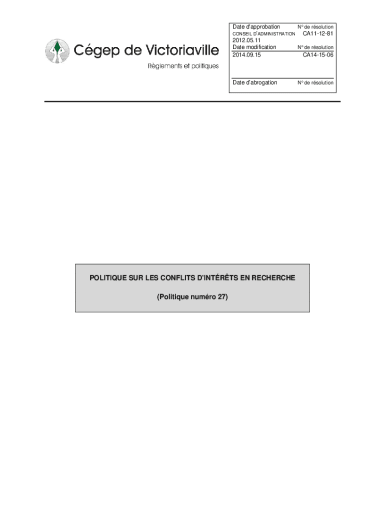 Date d\'approbation No de solution CONSENT ADMINISTRATION CA111281 2012.05.11 No de solution Date modification 2014.09.15 CA141506Date dabrogationPOLITIQUE SUR LES CONFLICTS DINT RTS EN Recherché