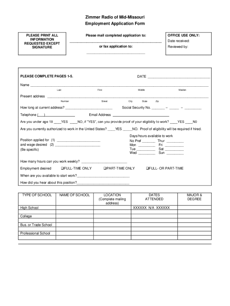 Zimmer Radio of MidMissouri Employment Application Form PLEASE PRINT ALL INFORMATION REQUESTED EXCEPT SIGNATUREPlease mail completed application to:OFFICE USE ONLY:___Date received:or fax application
