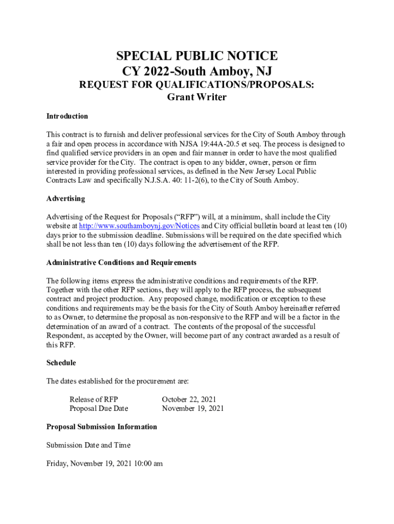 SPECIAL PUBLIC NOTICE CY 2022South Am boy, NJ REQUEST FOR QUALIFICATIONS×PROPOSALS: Grant Writer Introduction This contract is to furnish and deliver professional services for the City of South Am