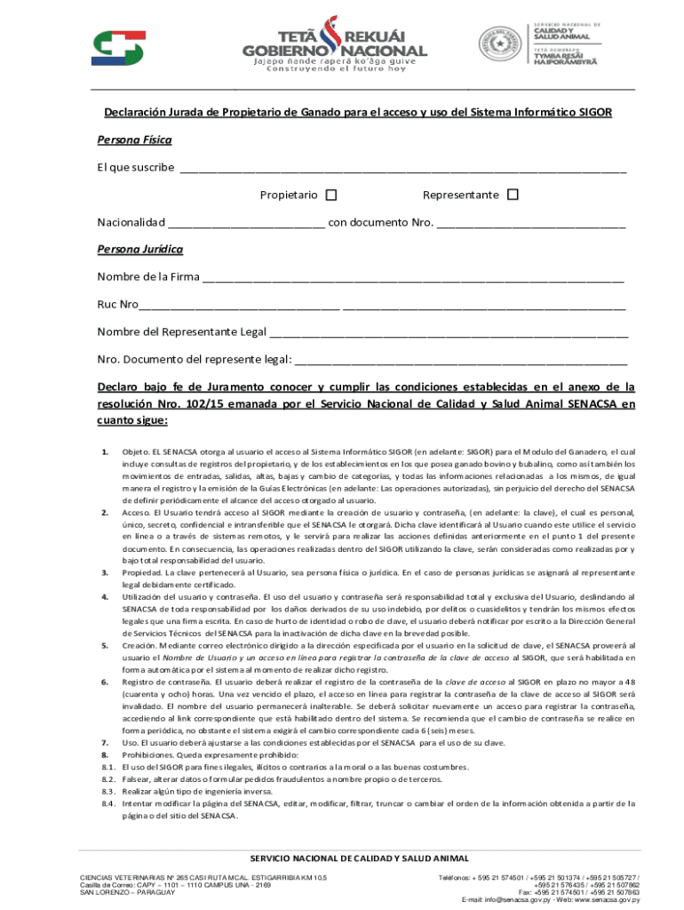 Declaration Jurado de Propietario de Ganado para El access y USO Del System Informatics RIGOR Persona FICA El Que subscribe ___ PropietarioRepresentanteNacionalidad ___ con document NRO. ___ Persona