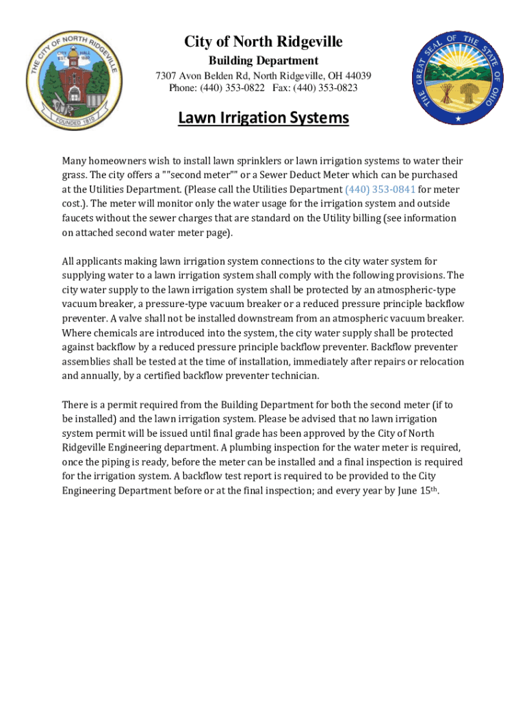 City of North Ridgeville Building Department 7307 Avon Been Rd, North Ridgeville, OH 44039 Phone: (440× 3530822 Fax: (440) 3530823Lawn Irrigation Systems Many homeowners wish to install lawn sprinklers