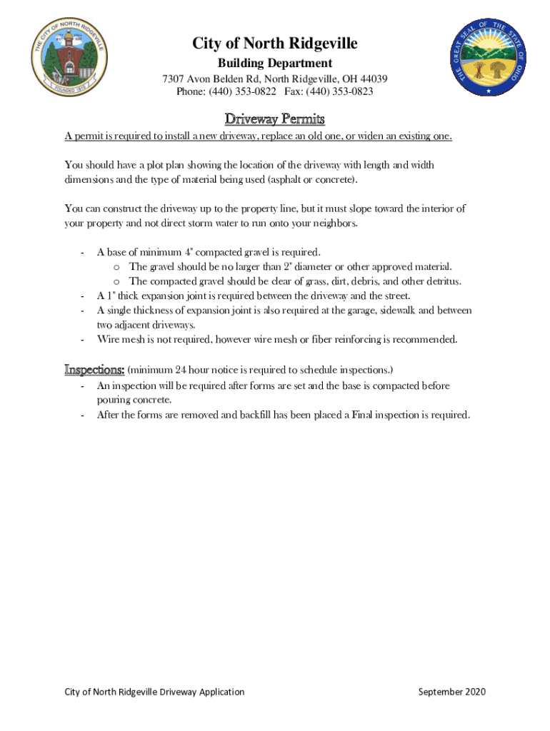 City of North Ridgeville Building Department 7307 Avon Been Rd, North Ridgeville, OH 44039 Phone: (440× 3530822 Fax: (440) 3530823Driveway Permits A permit is required to install a new driveway,