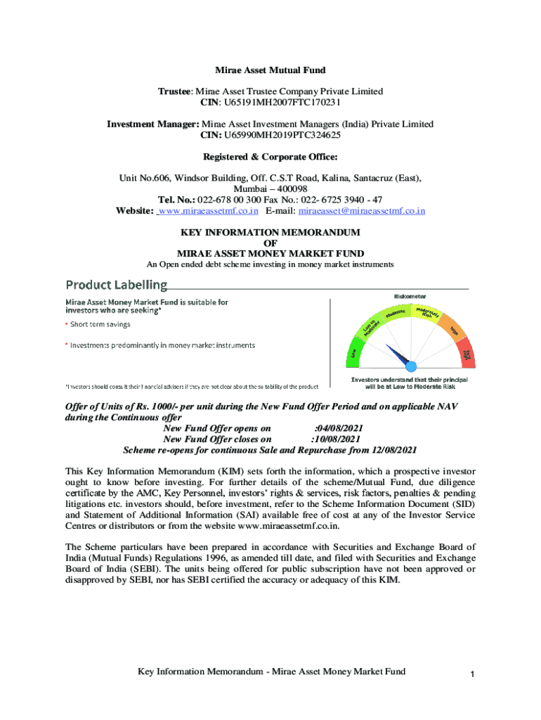 Get the free Key Information Memorandum - Mirae Asset Money Market Fund ...