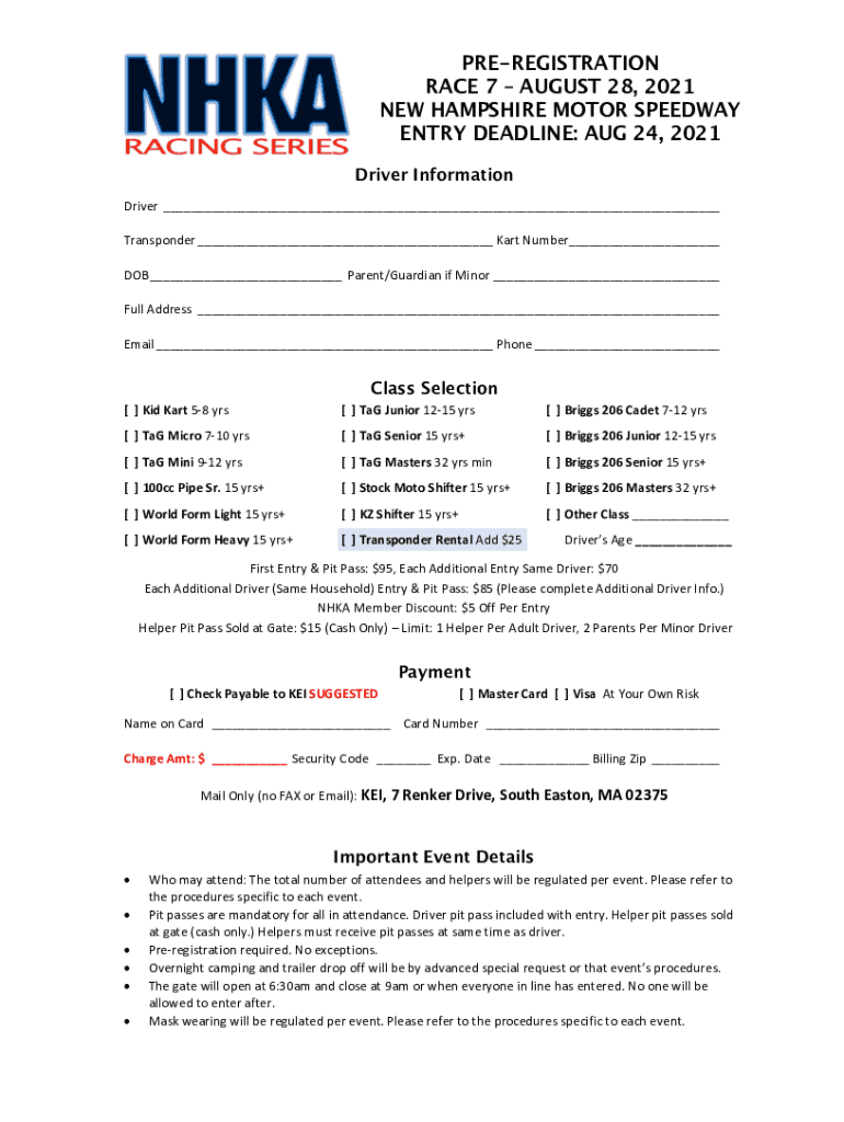 PREREGISTRATION RACE 7 AUGUST 28, 2022, NEW HAMPSHIRE MOTOR SPEEDWAY ENTRY DEADLINE: AUG 24, 2022 Driver Information Driver ___ Transponder ___ Kart Number___ DOB ___ Parent×Guardian if Minor ___