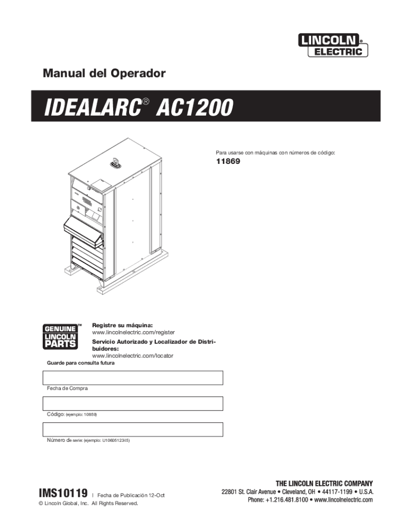 Manual Del Operator IDEAL ARC AC1200 Para users con Aquinas con numerous DE cargo:11869Registre SU Medina: www.lincolnelectric.com×register Service Authorized y Localized DE Distributors: www.lincolnelectric.com×locator