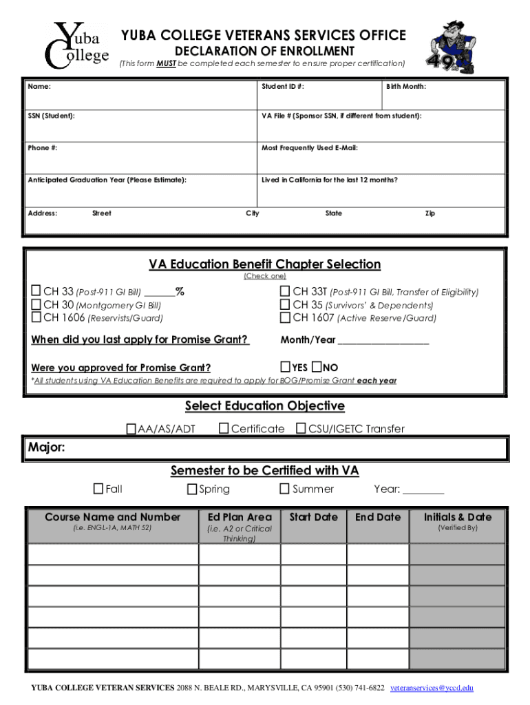 CUBA COLLEGE VETERANS SERVICES OFFICE DECLARATION OF ENROLLMENT (This form MUST be completed each semester to ensure proper certification) Name:Student ID #:SSN (Student):VA File # (Sponsor SSN, if