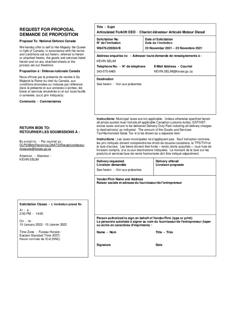 REQUEST FOR PROPOSAL DEMAND DE PROPOSITIONTitle SujetArticulated Forklift DID Chariot later Article Mother Diesel Solicitation No. N de l\'invitational of Solicitation Date DE invitation hereby offer