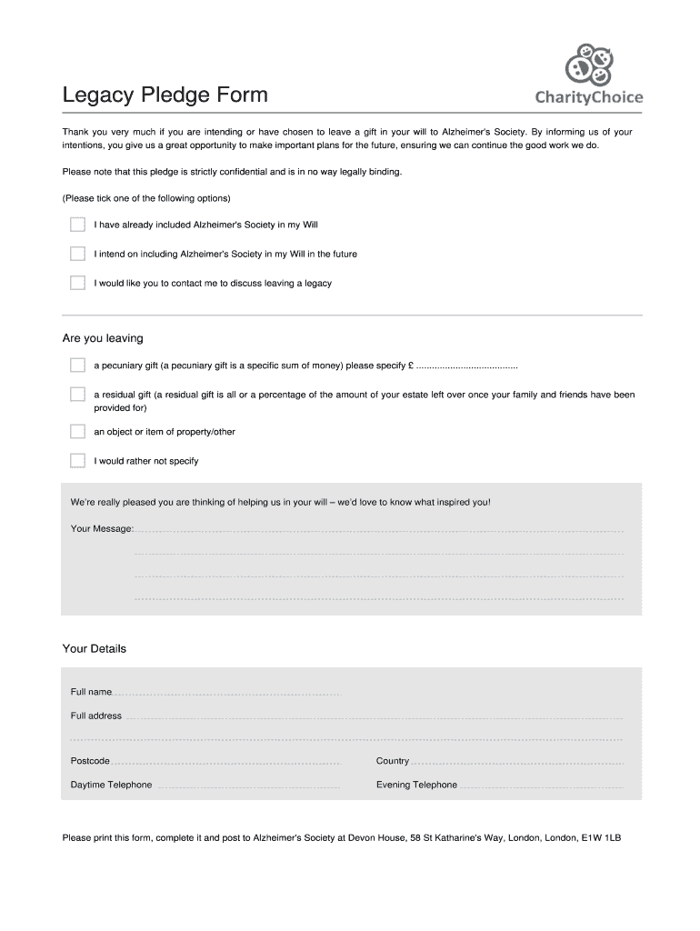 The Legacy Pledge Form is intended for anyone in the UK wishing to leave a gift in their will to the Alzheimer's Society. You do not need to be a current member or donor to complete the form.