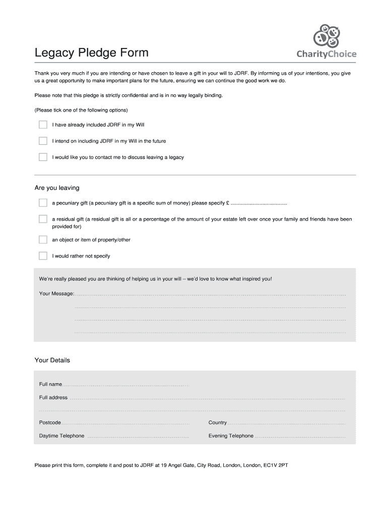 The Legacy Pledge Form is a personal legal document used by individuals in the UK to inform JDRF of their intention to leave a gift in their will.