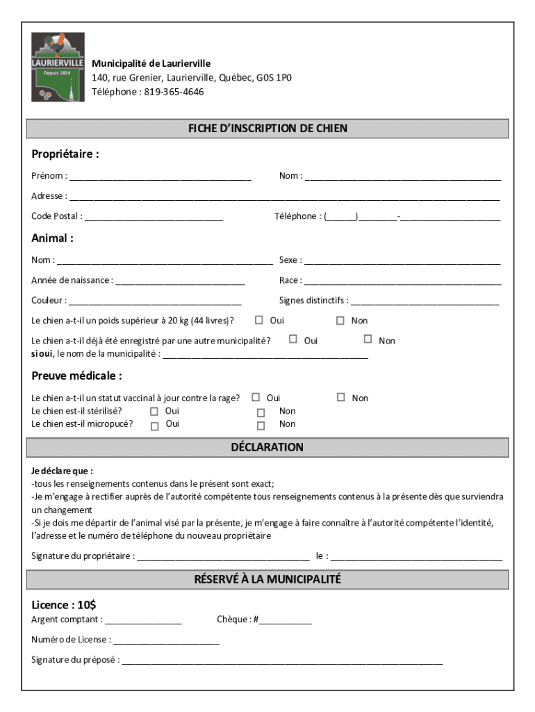 Municipality de Laurierville 140, rue Greater, Turberville, Quebec, G0S 1P0 Tl phone : 8193654646FICHE INSCRIPTION DE CHIEF Proprietary : Prom : ___Not : ___Address : ___ Code Postal : ___Tl phone