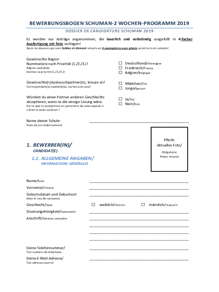 BEWERBUNGSBOGEN SCHUMAN2 WOCHENPROGRAMM 2019 DOSSIER DE CANDIDATURE SCHUMANN 2019 Es warden our Antigen angenommen, die Ehrlich UND vollstndig ausgefllt in 4facher Ausfertigung MIT Foot Verlaine!