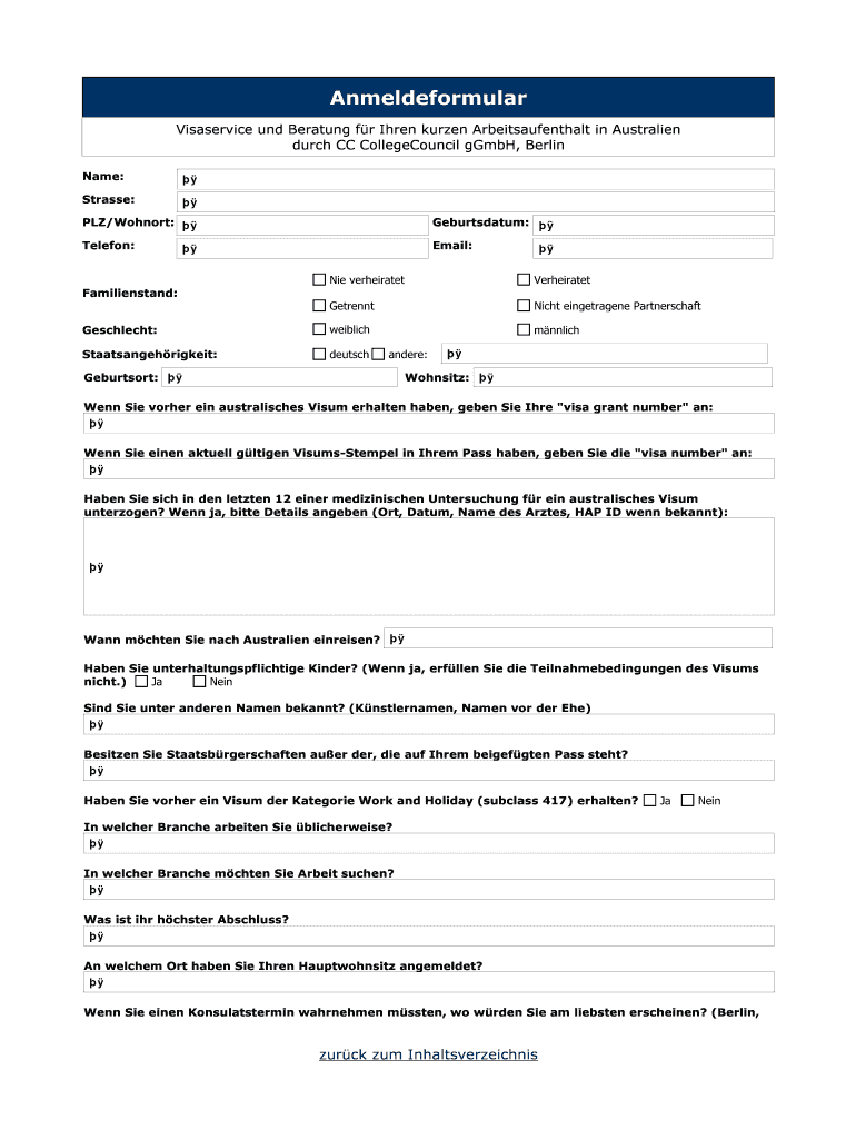 Auf dem Antragsformular für Work and Travel Australien müssen persönliche Daten, Reisepläne, Arbeitserfahrungen und finanzielle Mittel angegeben werden.