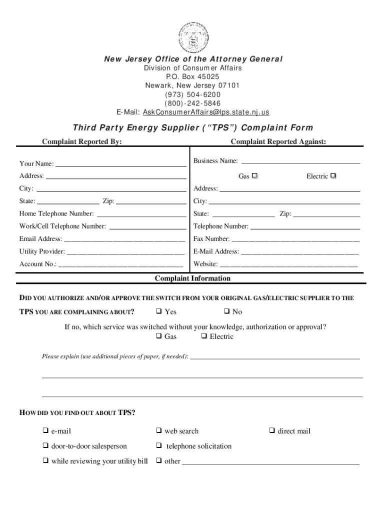 New Jersey Office of the Attorney General Division of Consumer Affairs P.O. Box 45025 Newark, New Jersey 07101 ×973× 5046200 ×800×2425846 Email: AskConsumerAffairs×LPS.state.NJ.third Party Energy
