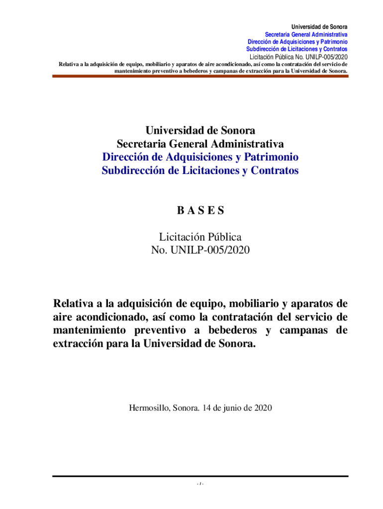 Universidad de Sonora Secretariat General Administrative Direction de Adquisiciones y Patrimony Subdireccin de Licitaciones y ContratosLicitacin Public No. UNILP005×2020Relativa à la acquisition
