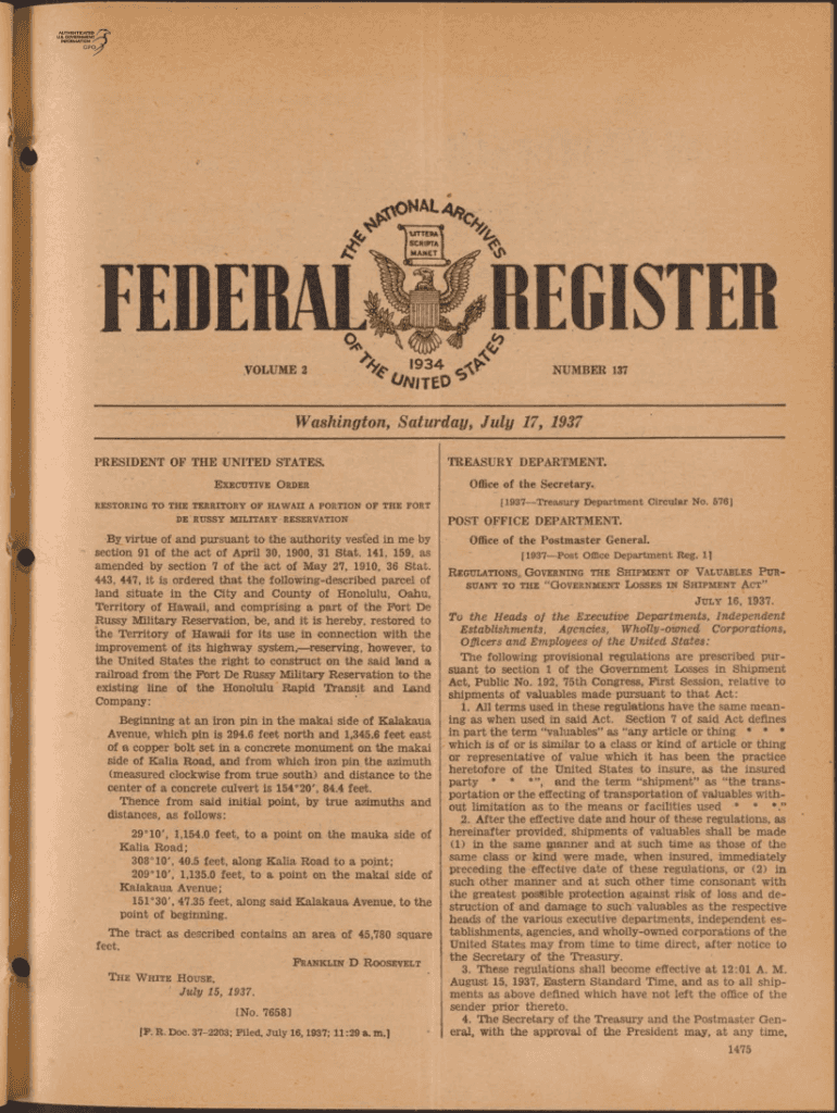 ’S, FEDERAL VO SUM E 2REGISTER 1934^^ \'ANTED IN U M B E R 137Washington, Saturday, July 17, 1937, PRESIDENT OF THE U N IT E D STATES. Executive Order RESTORING TO THE TERRITORY OF H AW AII A PORTION