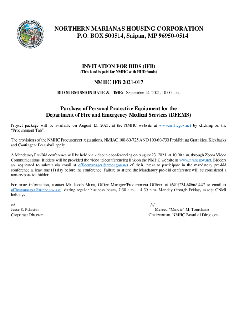 NORTHERN MARIANAS HOUSING CORPORATION P.O. BOX 500514, Sampan, MP 969500514INVITATION FOR BIDS (IF) (This is ad is paid for MHC with HUD funds×MHC IF 2021017 BID SUBMISSION DATE & TIME: September