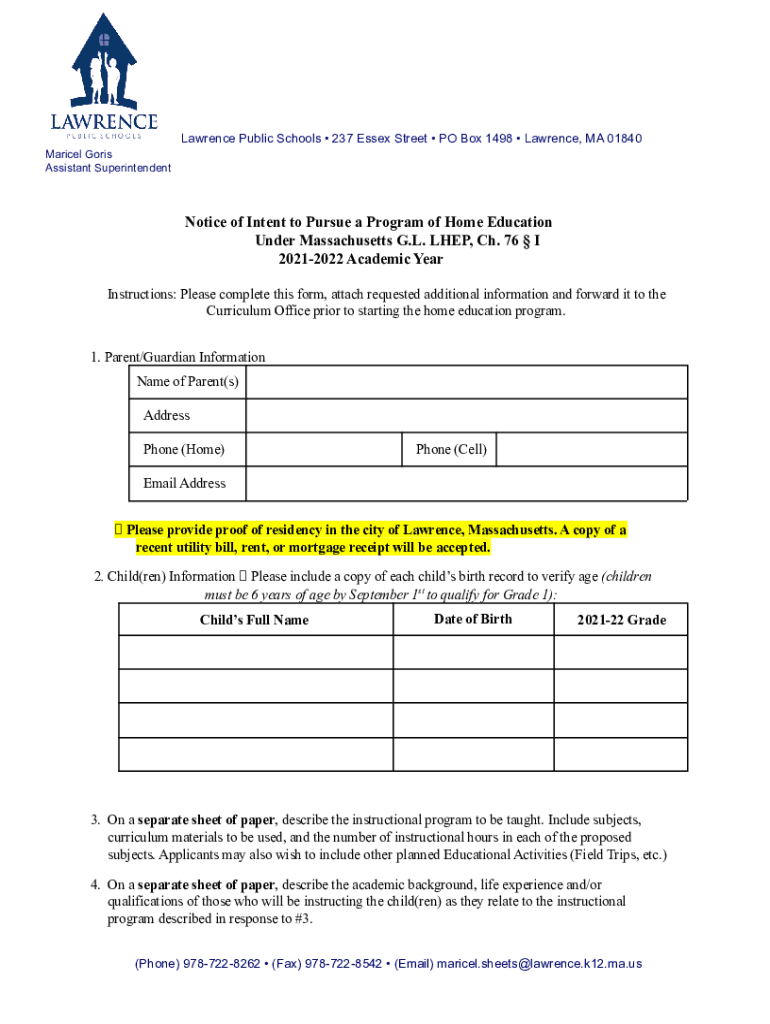 Lawrence Public Schools 237 Essex Street PO Box 1498 Lawrence, MA 01840 Marcel Boris Assistant SuperintendentNotice of Intent to Pursue a Program of Home Education Under Massachusetts G.L. HEP, Ch.