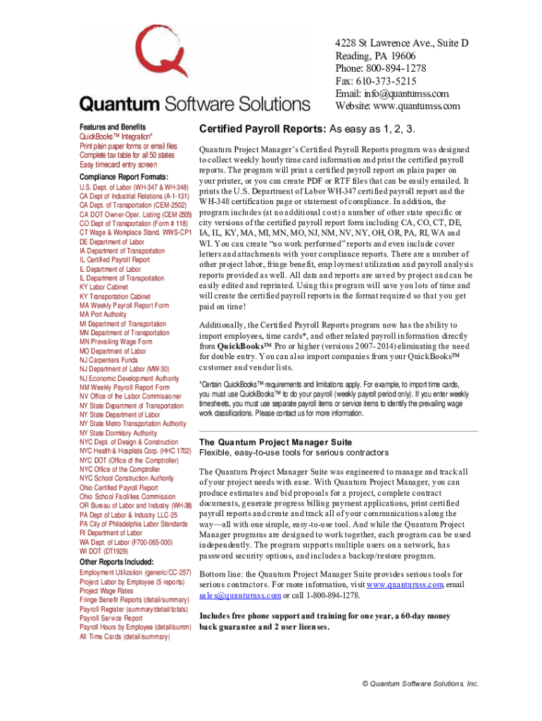 4228 St Lawrence Ave., Suite D Reading, PA 19606 Phone: 8008941278 Fax: 6103735215 Email: info×quantumss.com Website: www.quantumss.com Features and Benefits QuickBooks Integration* Print plain paper