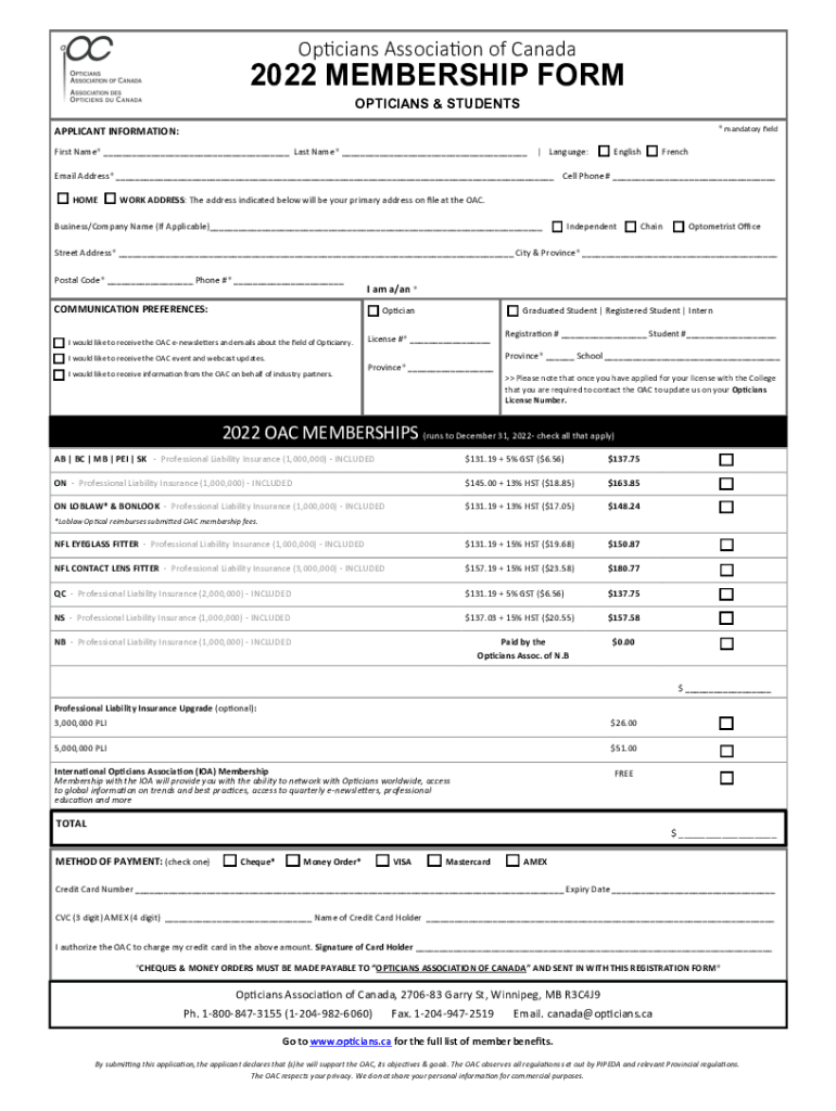 Opticians Association of Canada2022 MEMBERSHIP FORM OPTICIANS & STUDENTS * mandatory fieldAPPLICANT INFORMATION: First Name* ___ Last Name* ___| Language:EnglishFrenchEmail Address* ___ Cell Phone