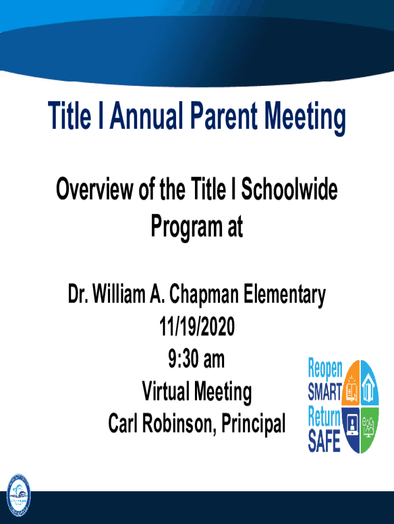 Title I Annual Parent Meeting Overview of the Title I Schoolwide Program at Dr. William A. Chapman Elementary 11×19/2020 9:30 am Virtual Meeting Carl Robinson, PrincipalAgenda 1. 2. 3. 4. 5. 6. 7.