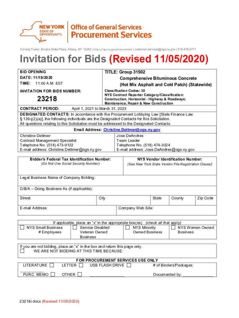 Corning Tower, Empire State Plaza, Albany, NY 12242 | HTTPS://dogs.NY.gov×procurement | customer.services×dogs.NY.gov | 5184746717Invitation for Bids (Revised 11×05/2020) BID OPENING DATE: 11×19/2020