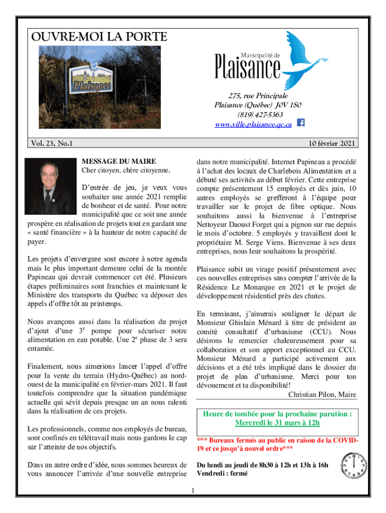 SUPREMO LA PORTE275, rue Principal Alliance (Quebec) J0V 1S0 (819× 4275363 www.ville.plaisance.qc.ca Vol. 23, No.110 frier 2021 MESSAGE DU MAINE Cher citizen, care Cheyenne, days note municipality.