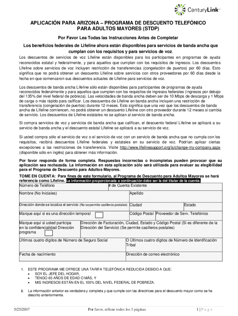 APPLICATION PARA ARIZONA PROGRAM DE DESCENT TELEFONICA PARA ADULTS MAYORS (STOP) POR Favor Lea Today leis Instructions Antes de Completar Los beneficial federals DE Lifeline hora ESPN disposables