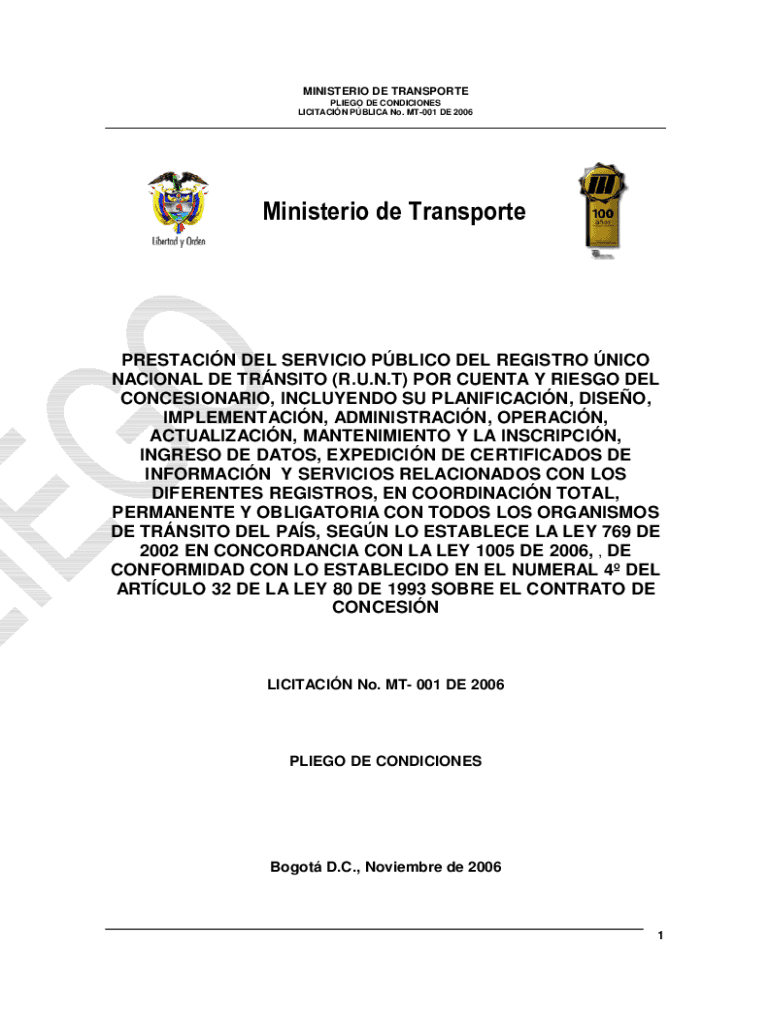 MINISTER DE TRANSPORTEPLIEGO DE CONDITIONS LIMITATION PBL ICA No. MT001 DE 2006PRESTACIN DEL SERVICE PBL ICO DEL REGISTRY NICO NATIONAL DE TRANSIT (R.U.N.T) POR CENT Y DIEGO DEL CONCESSIONARY, INCLUDED