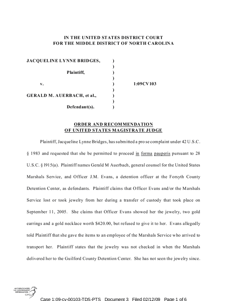 IN THE UNITED STATES DISTRICT COURT FOR THE MIDDLE DISTRICT OF NORTH CAROLINAJACQUELINE LYNNE BRIDGES, Plaintiff, v. GERALD M. AUERBACH, et al., Defendant’s).) ))))))))1:09CV103ORDER AND RECOMMENDATION