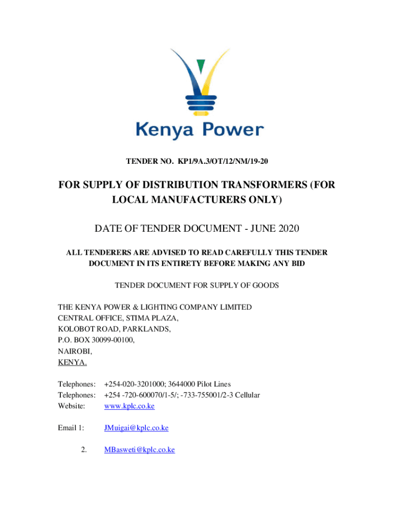 TENDER NO. KP1×9A.3/OT×12/NM×1920FOR SUPPLY OF DISTRIBUTION TRANSFORMERS (FOR LOCAL MANUFACTURERS ONLY) DATE OF TENDER DOCUMENT JUNE 2020 ALL TENDERER ARE ADVISED TO READ CAREFULLY THIS TENDER