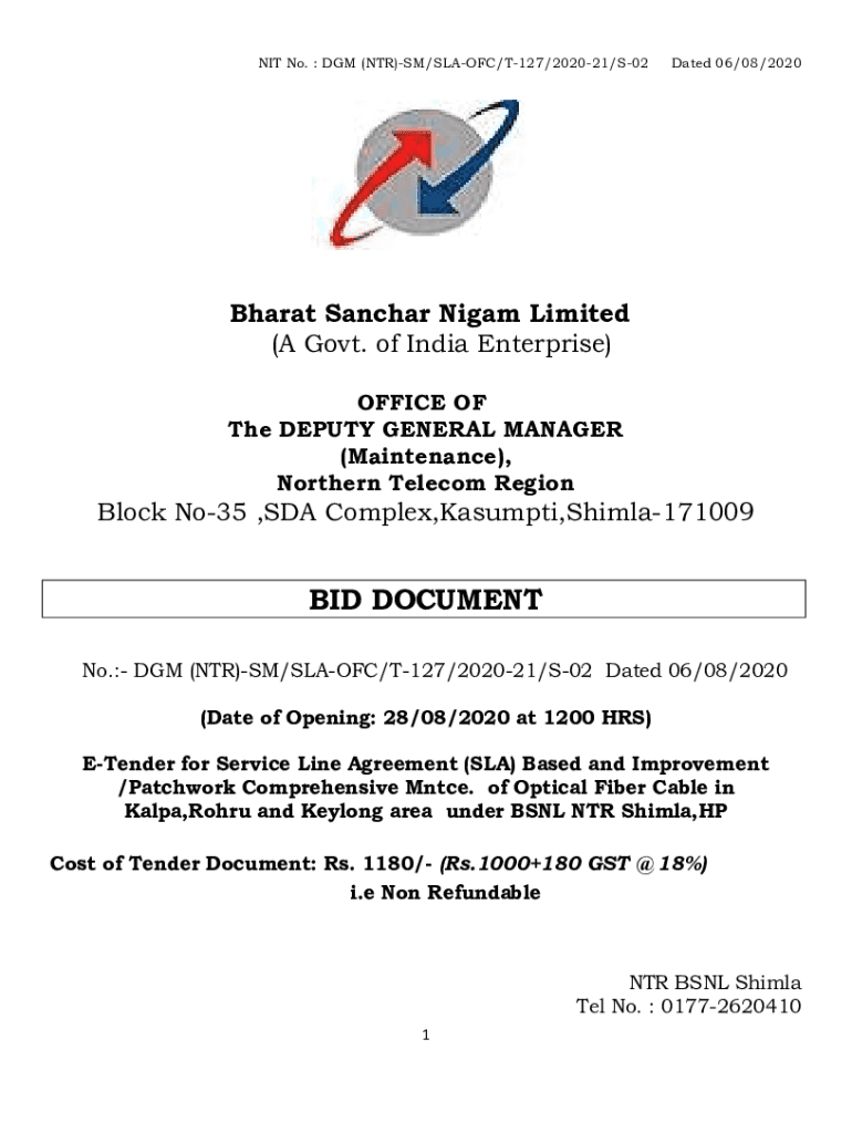 NIT No. DAM (NTR×SM/SLAVIC×T127/202021×S02Dated 06×08/2020Bharat San char Night Limited (A Govt. of India Enterprise) OFFICE OF The DEPUTY GENERAL MANAGER (Maintenance×, Northern Telecom RegionBlock