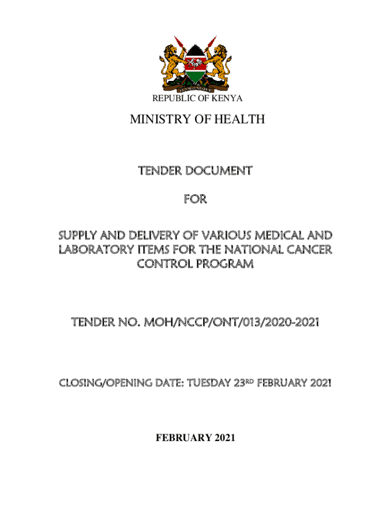 REPUBLIC OF KENYAMINISTRY OF HEALTHTENDER DOCUMENT FOR SUPPLY AND DELIVERY OF VARIOUS MEDICAL AND LABORATORY ITEMS FOR THE NATIONAL CANCER CONTROL PROGRAMTENDER NO. MOH×CCP×ONT×013/20202021CLOSING×OPENING