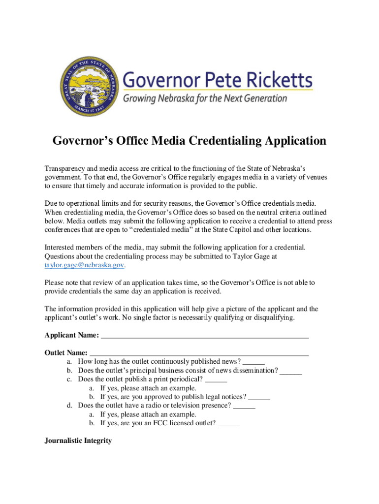 Governors Office Media Credentialing Application Transparency and media access are critical to the functioning of the State of Nebraska's government. To that end, the Governors Office regularly engages