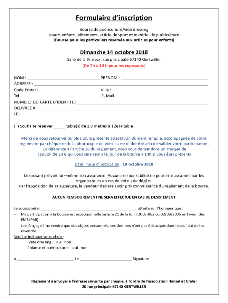 Individuals or organizations organizing such events are required to file brocantes vide-dressing et bourses.