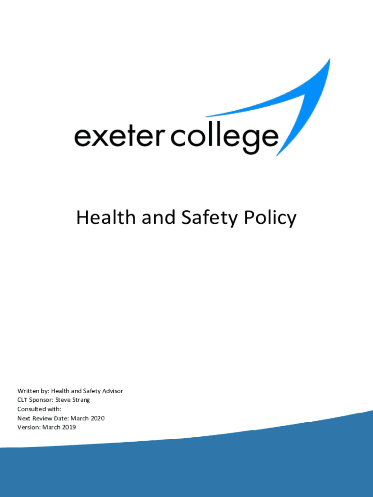 Health and Safety PolicyWritten by: Health and Safety Advisor CLT Sponsor: Steve Strong Consulted with: Next Review Date: March 2020 Version: March 2019Health and Safety Policy March 2019Page 1 of