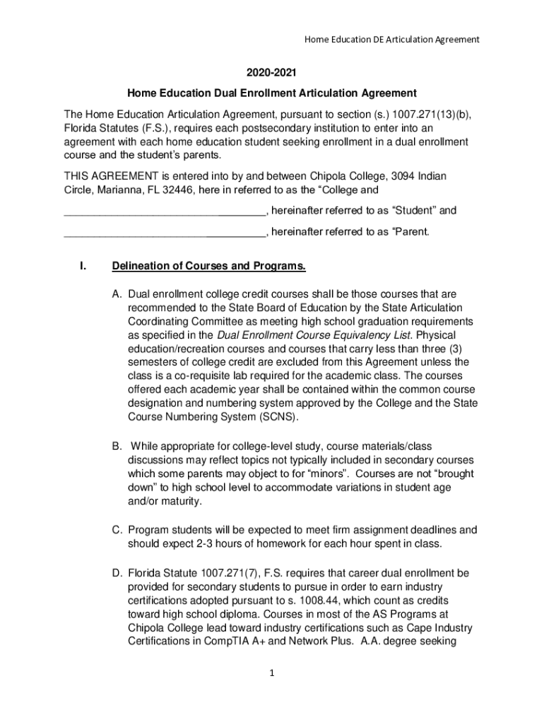 Home Education DE Articulation Agreement20202021 Home Education Dual Enrollment Articulation Agreement The Home Education Articulation Agreement, pursuant to section (s.× 1007.271×13)(b×, Florida