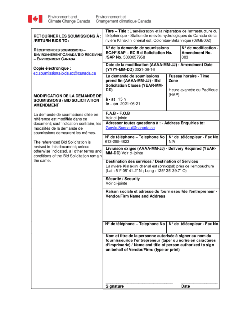 RETURNER LES COMMISSIONS : /RETURN BIDS TO:Title : Amelioration ET la reparation DE infrastructure Du technique Station DE relets hydrologists Du Canada de la riv ire Klinaklini Cheney est, ColombieBritannique
