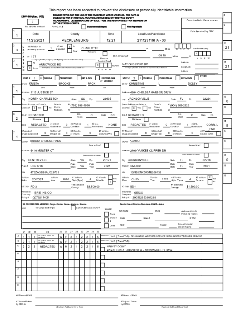 This report has been redacted to prevent the disclosure of personally identifiable information. 2 No. of Units Involved13 31L O C A T I ON Form 1 of 1Supplemental ReportTimeLocal Use×Patrol Area11×23/2021MECKLENBURG12:21211123119HA