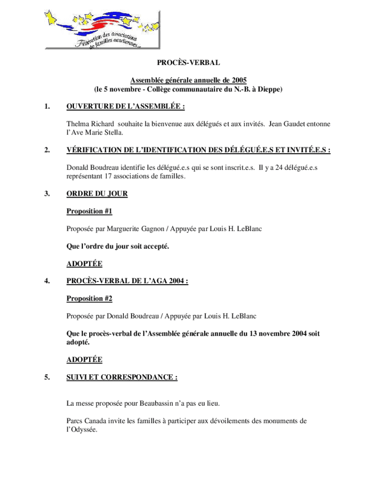 PROCÈS-VERBAL Assemble GRALE annually DE 2005 (LE 5 November College communautaire Du N.B. Dipped) 1.OUVERTURE DEL ASSEMBLE : Thelma Richard suite la revenue aux plus ET aux invite. Jean Garden entonne