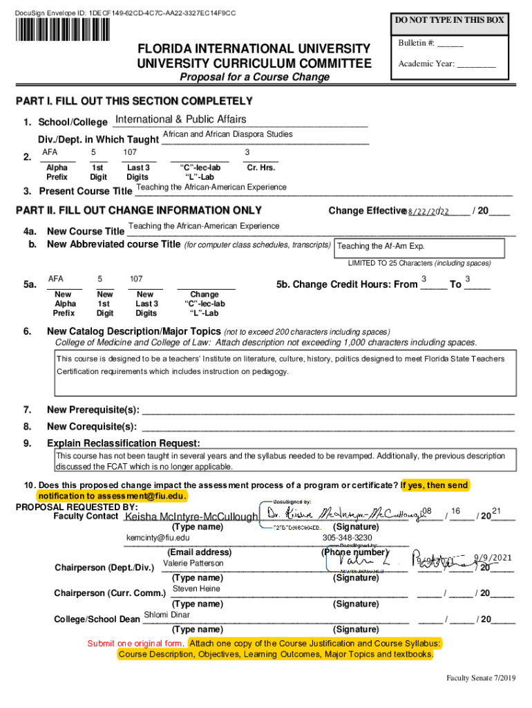 DocuSign Envelope ID: 1DECF14962CD4C7CAA223327EC14F9CC×CRS CHG×DO NOT TYPE IN THIS FLORIDA INTERNATIONAL UNIVERSITY CURRICULUM COMMITTEEBulletin #: ___ Academic Year: ___Proposal for a Course Change