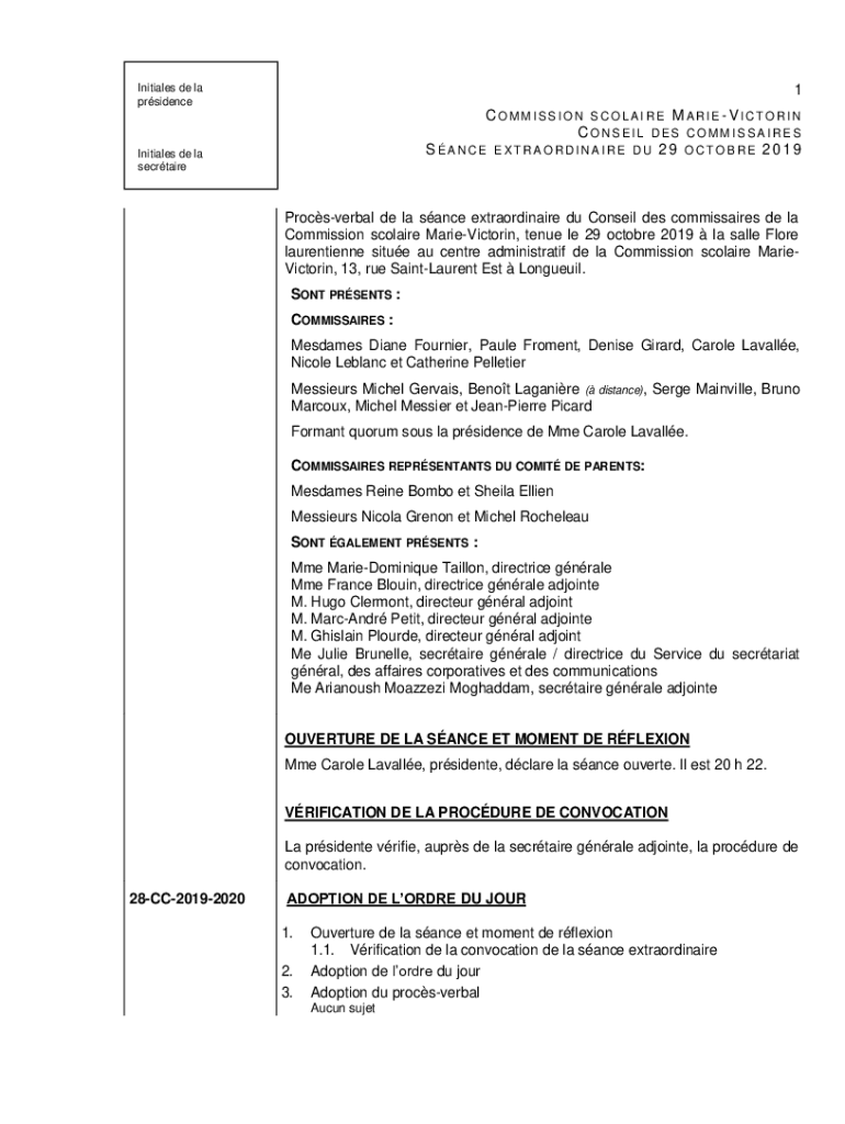 1Initiales de la prsidenceCOMMISSION CLAIRE MARIEVICTORIN CONSENT DES COMMISSARS SINCE EXTRAORDINAIRE DU 29 OCTOBER 2019Initiales de la secrtaireProcsverbal de la since extraordinaire Du Conrail DES