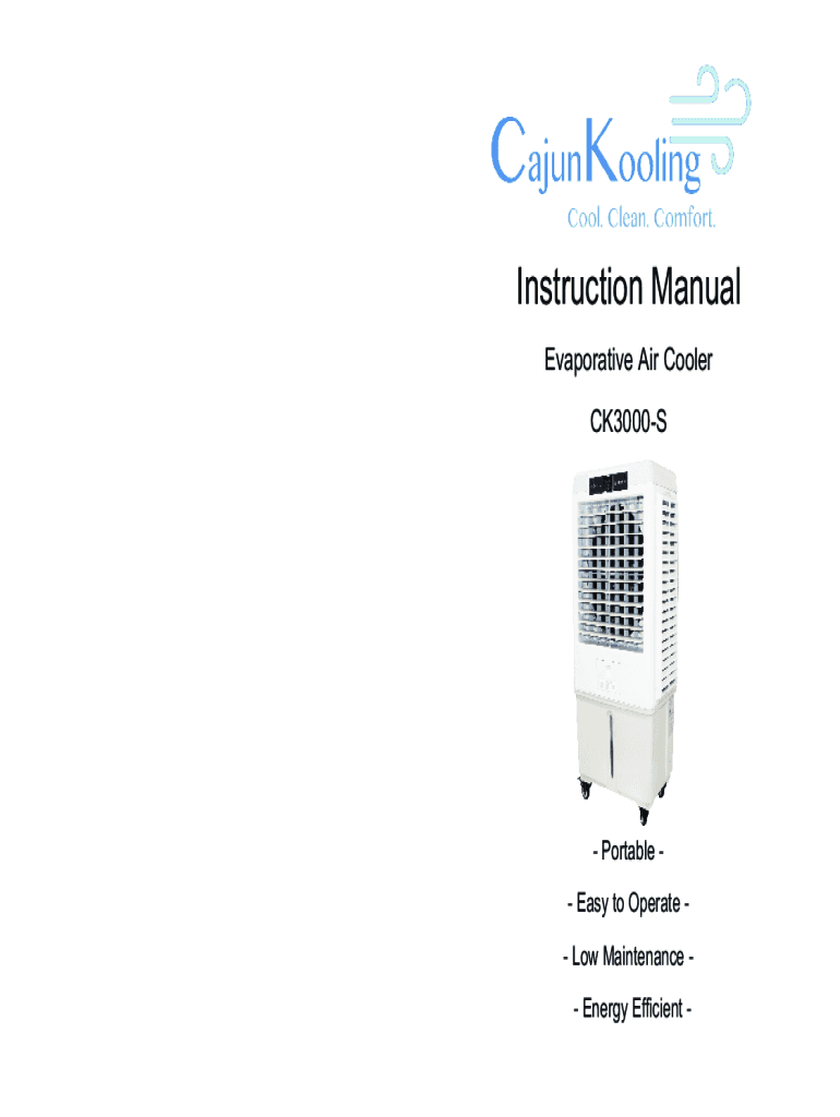 Instruction Manual Evaporative Air Cooler CK3000S Portable Easy to Operate Low Maintenance Energy Efficient Important Safety Instructions READ AND SAVE THESE IMPORTANT SAFETY INSTRUCTIONS BEFORE USING