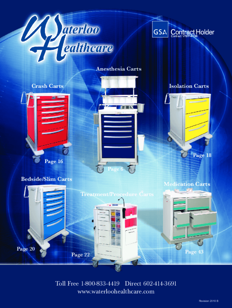 Anesthesia Carts Isolation Gatecrash Carts Page 18Page 16Page 6Bedside×Slim CartsTreatment×Procedure Carts Page 20Medication Carts Page 22Toll Free 18008334419 Direct 6024143691 www.waterloohealthcare.comPage