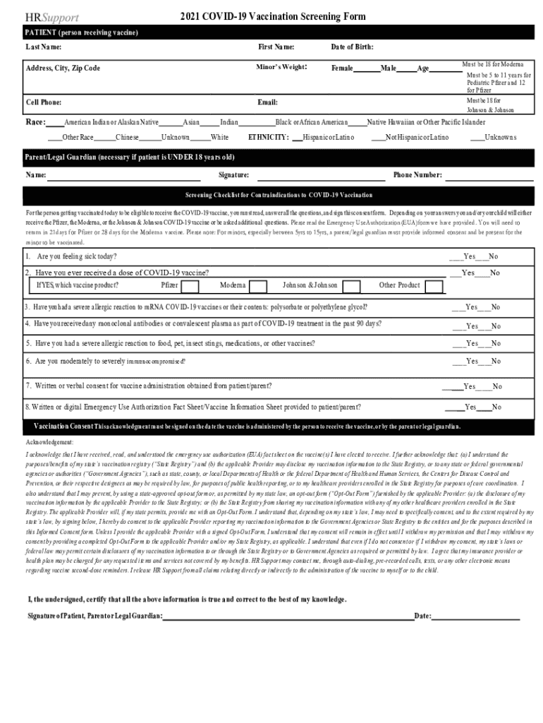 2021 COVID-19 Vaccination Screening Form PATIENT (person receiving vaccine) Last Name:First Name:Date of Birth:Address, City, Zip Coterminous Weight:Femaleness Phone:Email:Race:American Indian or